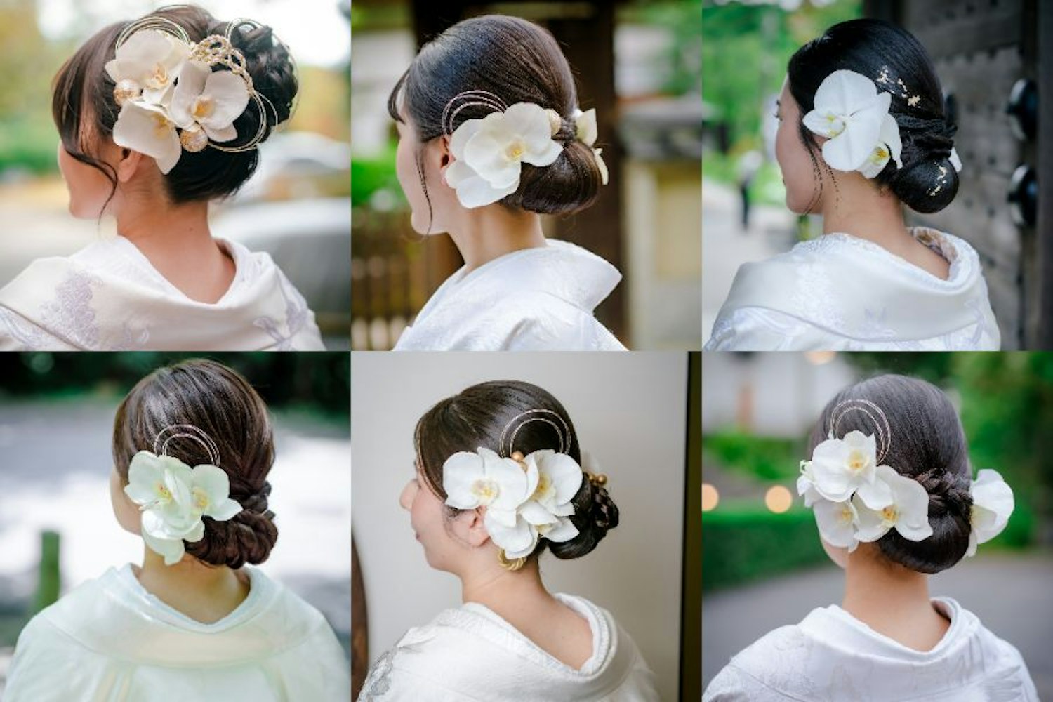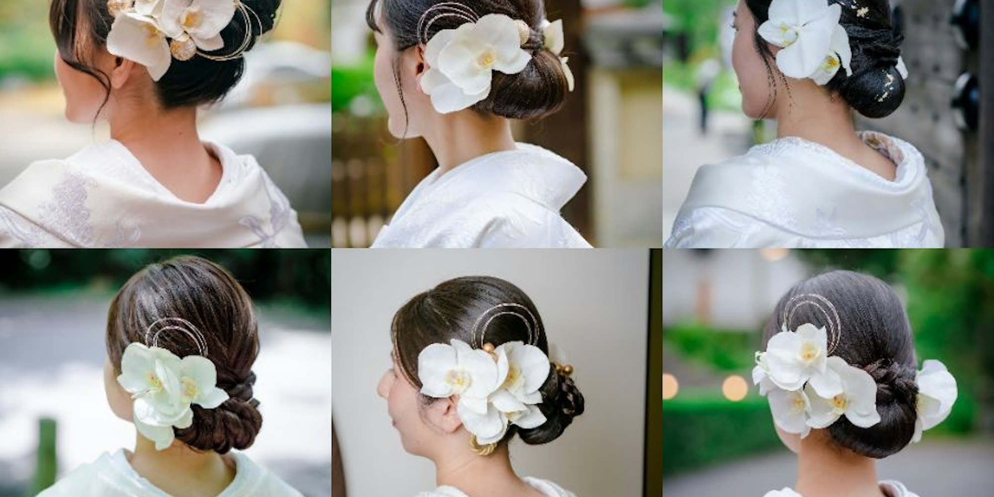 最近は、タイトなシニヨンに胡蝶蘭を合わせる、大人っぽく洗練されたスタイルがとても人気です。