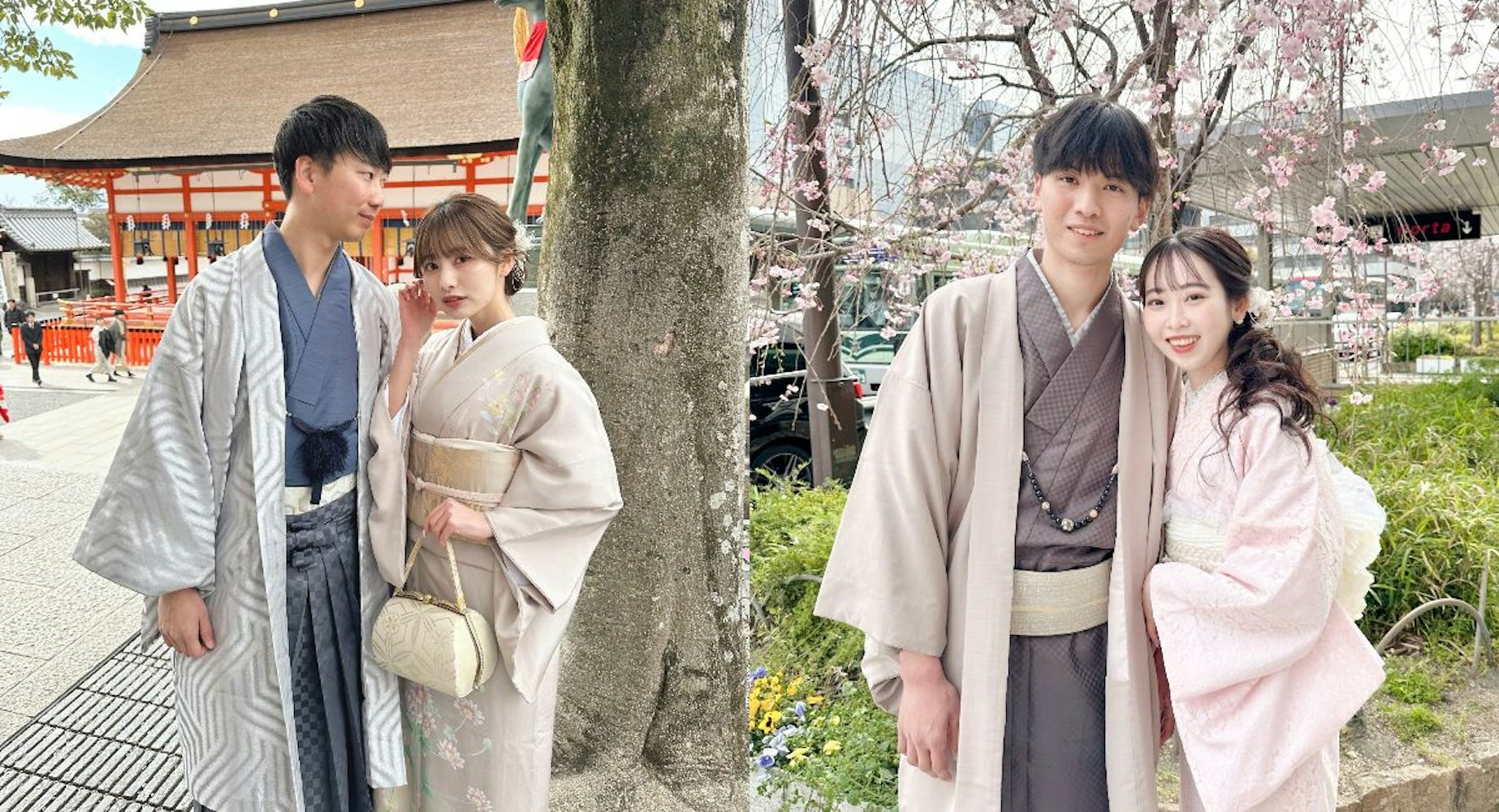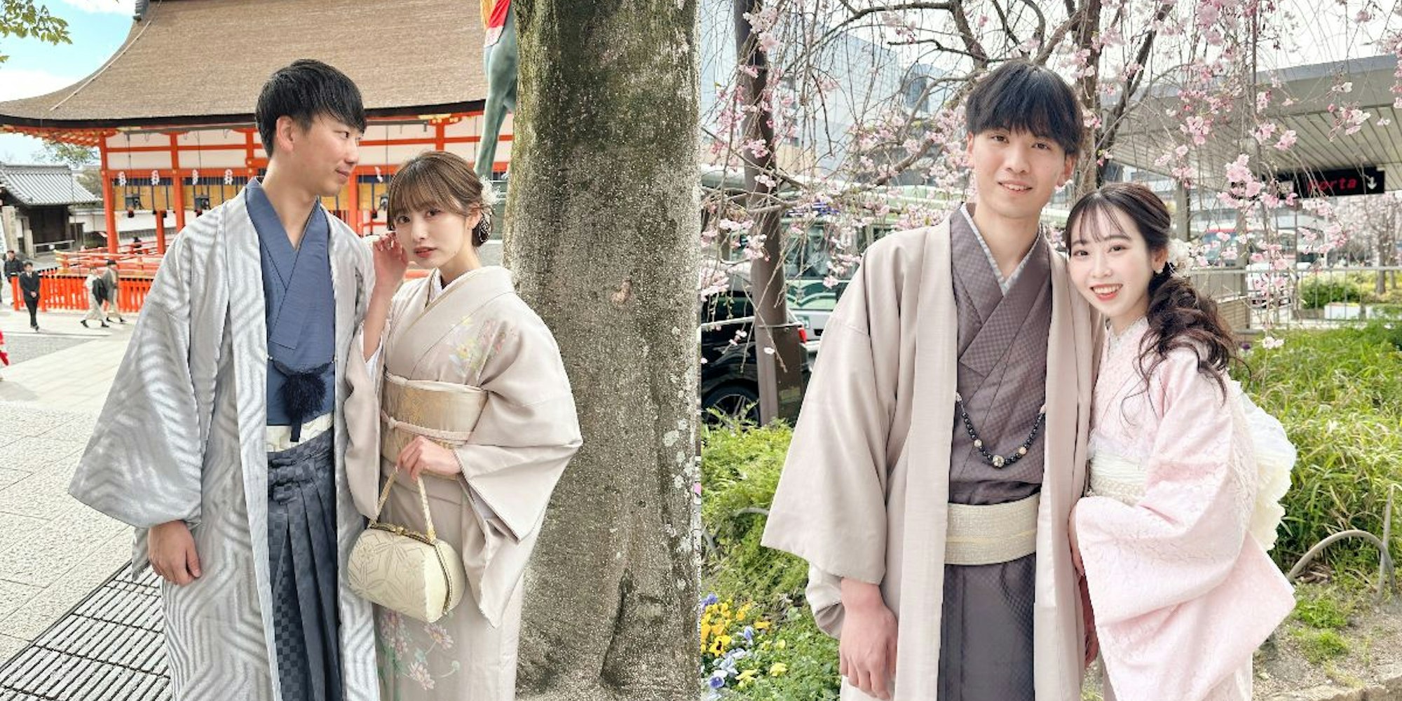 男性向けにはモダン紋付や袴プランもあり、ペアでのコーディネートも可能。カップルや友人同士でお揃いの着物コーデを楽しみながら、清水寺や寧々の道など周辺観光スポットでの写真撮影もおすすめです。