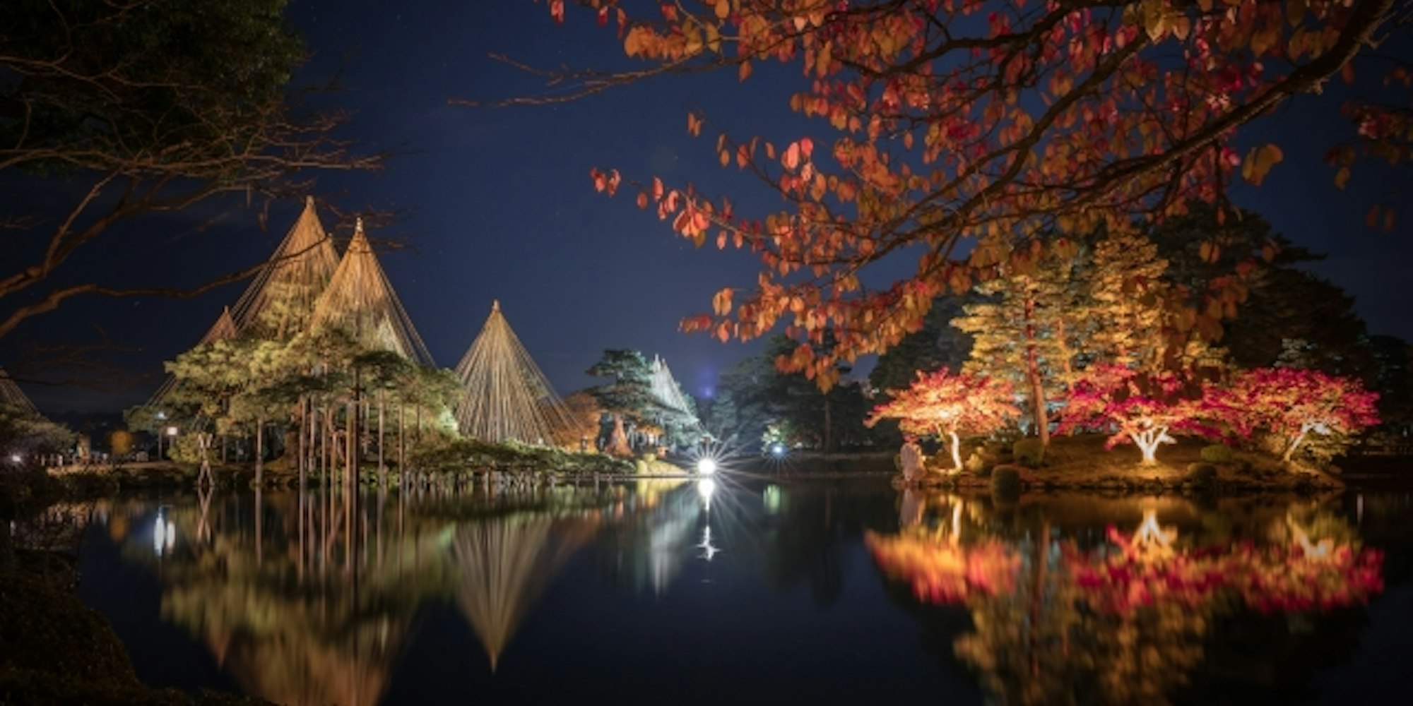 At Kenrokuen Garden, night illuminations are held annually in autumn as part of the "Kanazawa Castle & Kenrokuen Garden Four Seasons Story: Autumn Chapter." The autumn leaves around Hisagoike Pond and the Karasaki Pine, adorned with "yukitsuri" (snow ropes), a winter tradition, are illuminated, creating a fantastical landscape. Another appealing point is that admission is free during the illumination hours.
