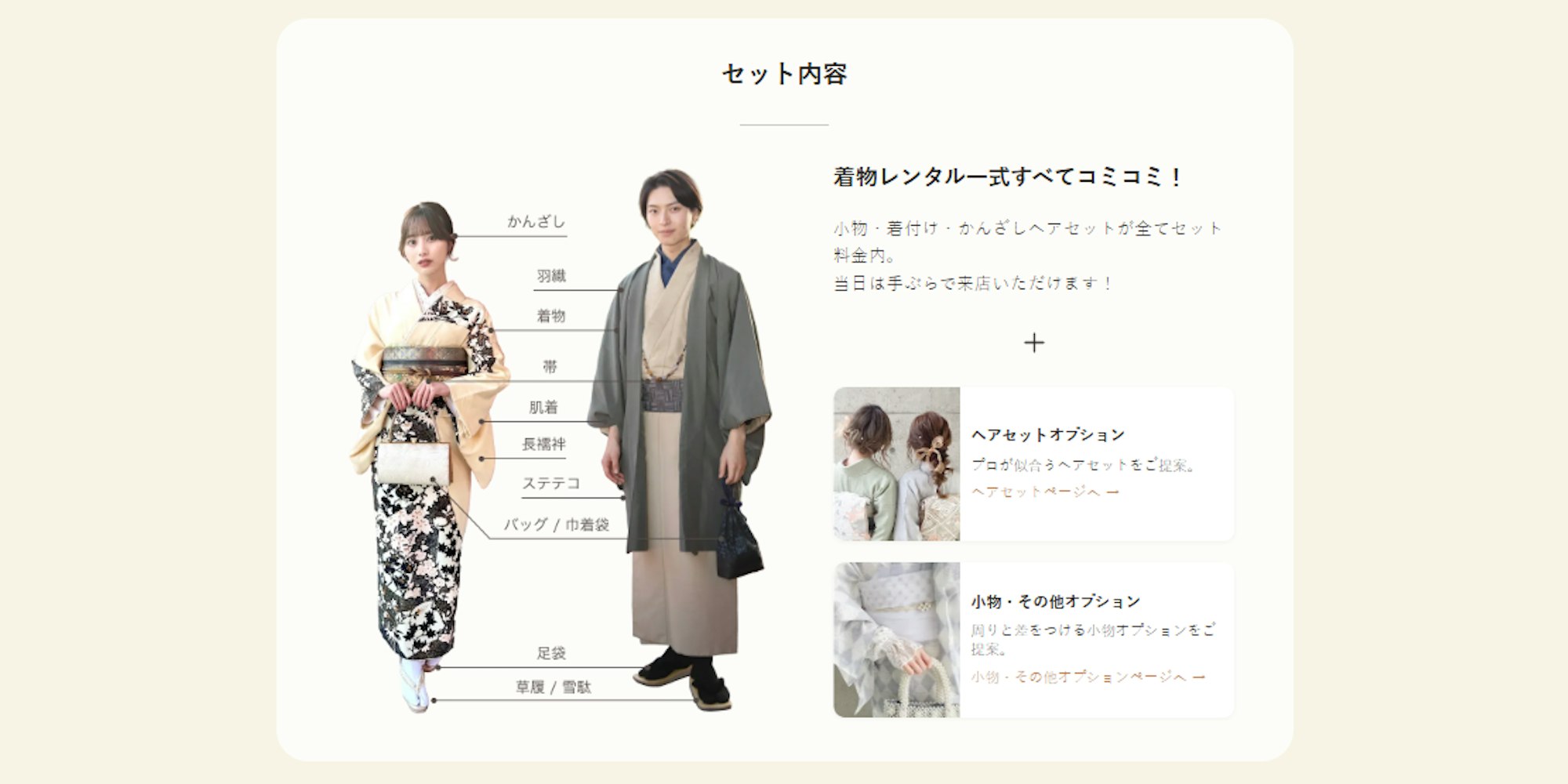 小物・着付けが全てセット料金内に含まれます。 当日は手ぶらで来店いただけます!