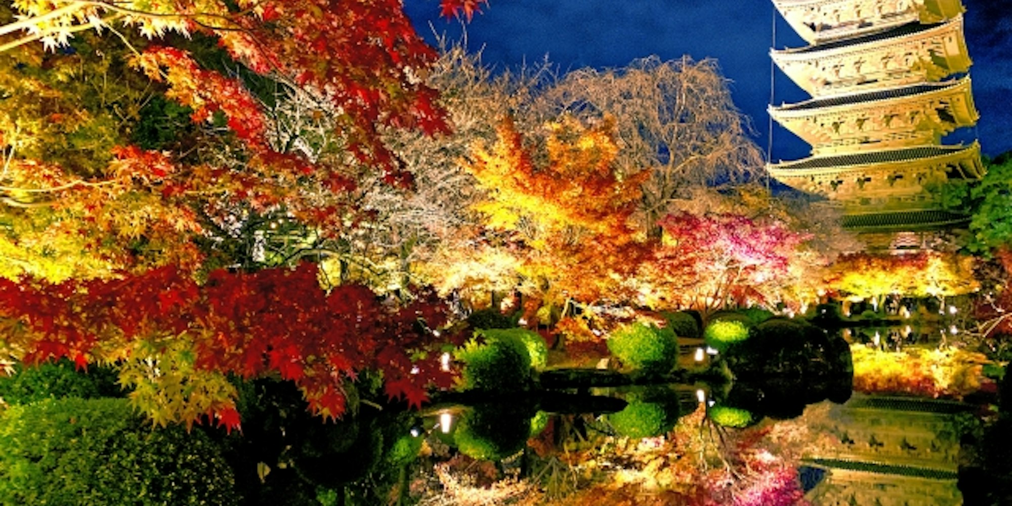 世界遺産・東寺の象徴である国宝の五重塔を背景に、ライトアップされた紅葉が池に映り込む光景は息をのむ美しさ。「THE 京都」というべき荘厳で幻想的な夜景を楽しめます。