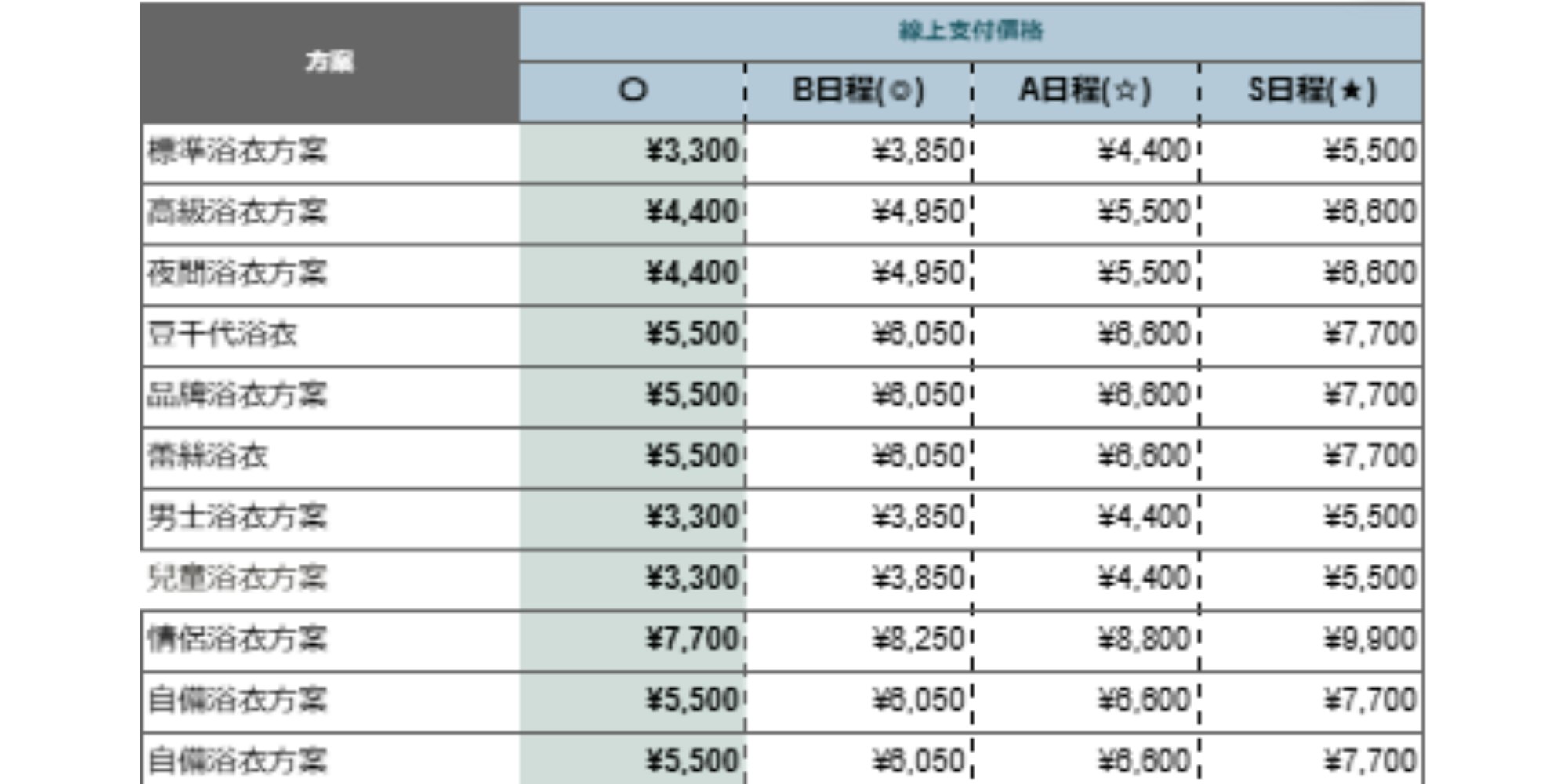 旺季追加費方案費用一覽表