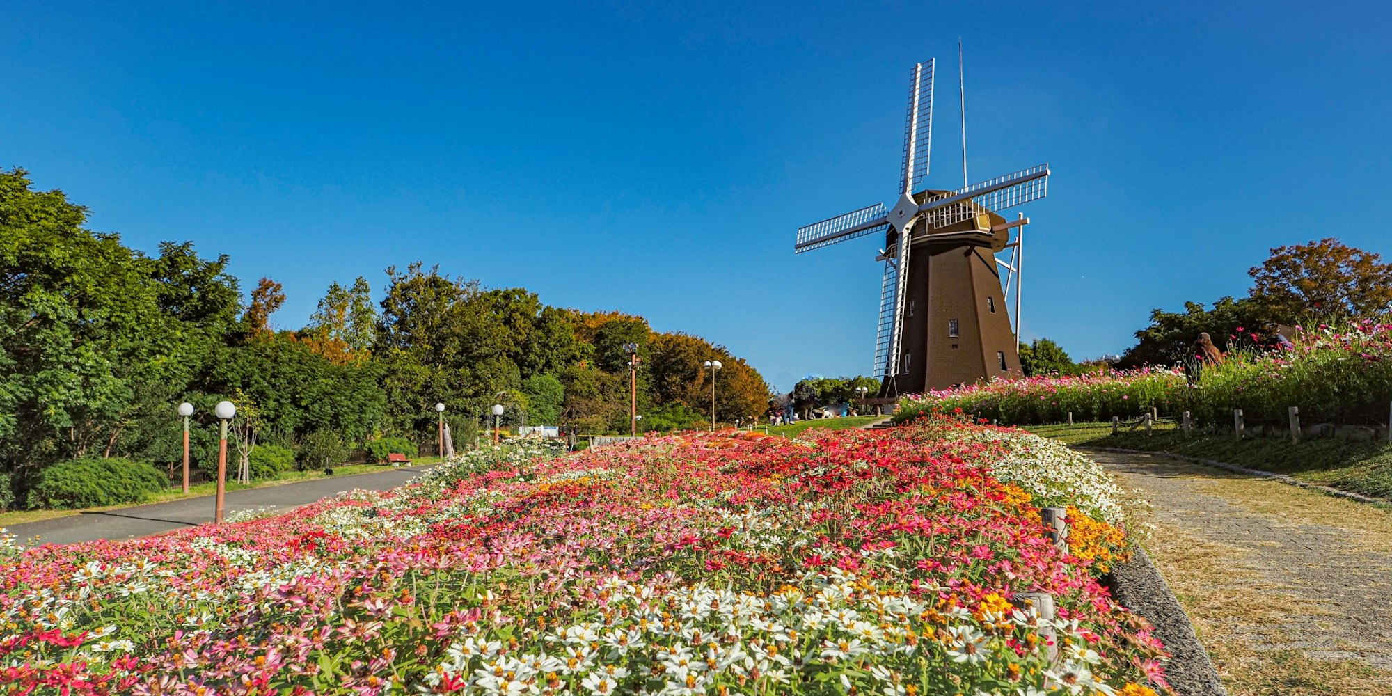 Panoramic View of Vast Flowers and Windmills | Tsurumi Ryokuchi Park (Expo '90 Commemorative Park)