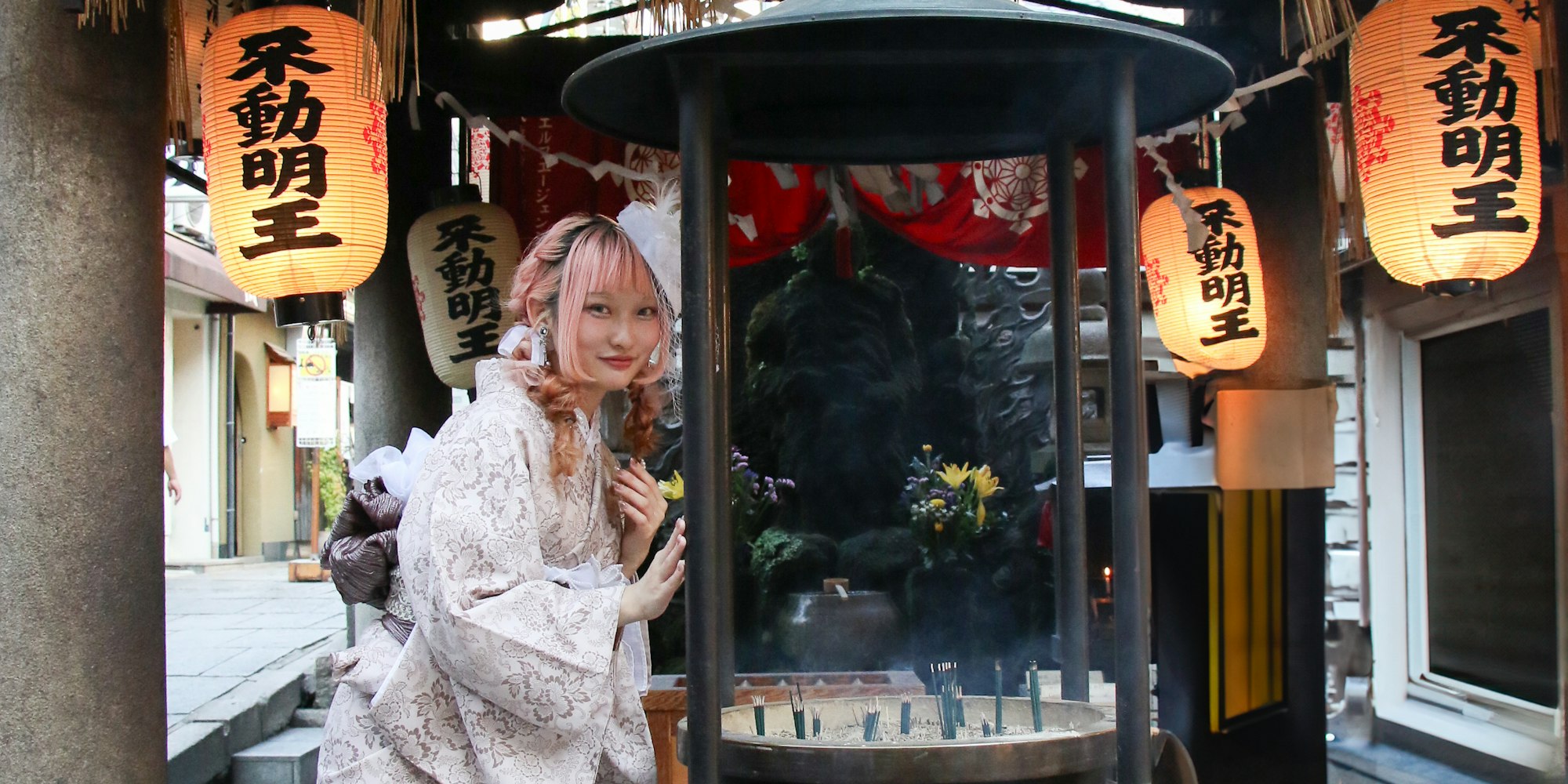 数えきれない提灯の灯りに包まれ、日本らしい趣ある風景を着物姿で美しく撮影できます。