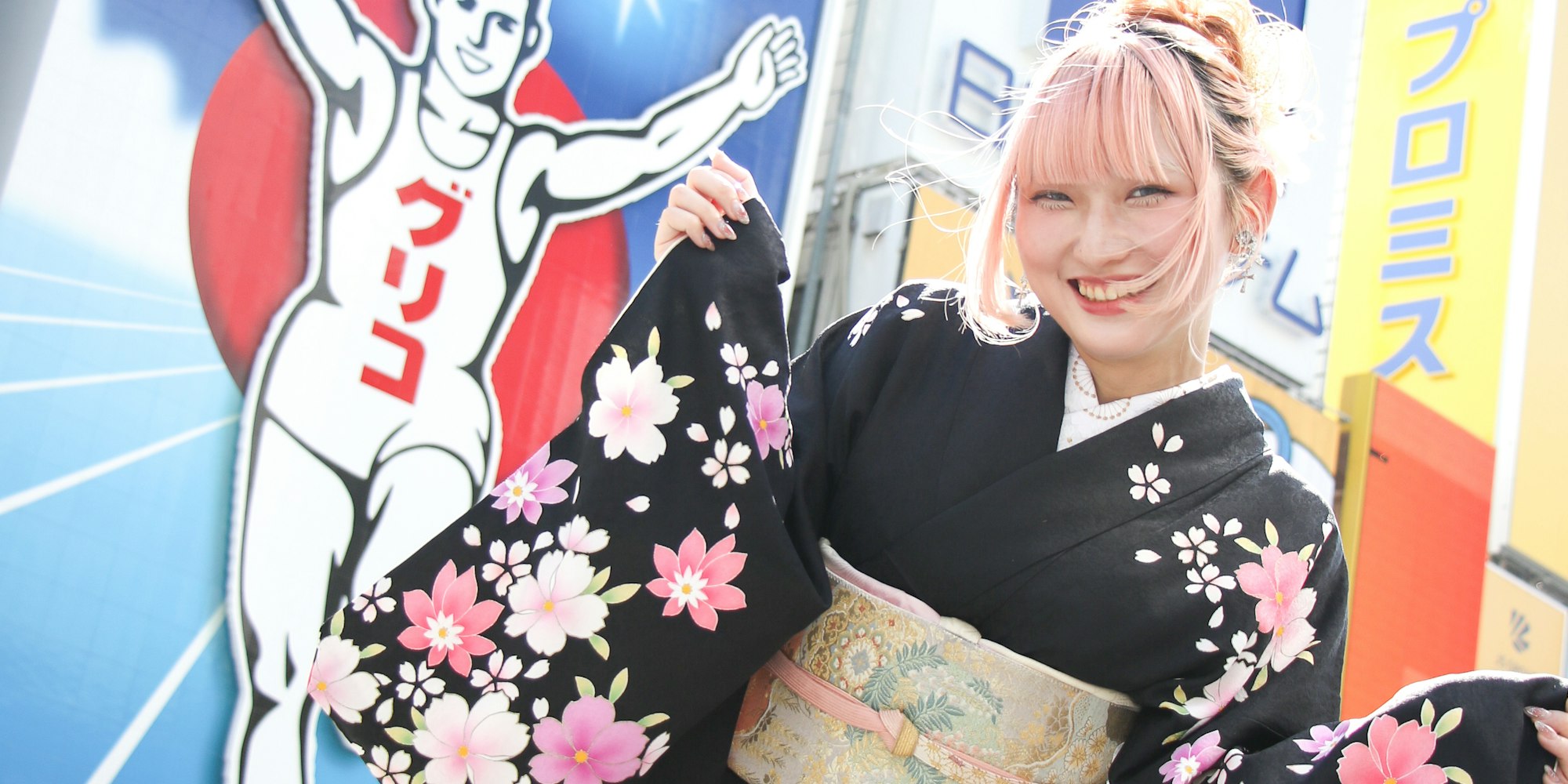 “大阪・道頓堀×着物撮影”サービスは、大阪のグリコサインや道頓堀商店街、法善寺横丁を着物で観光している姿を撮影します。