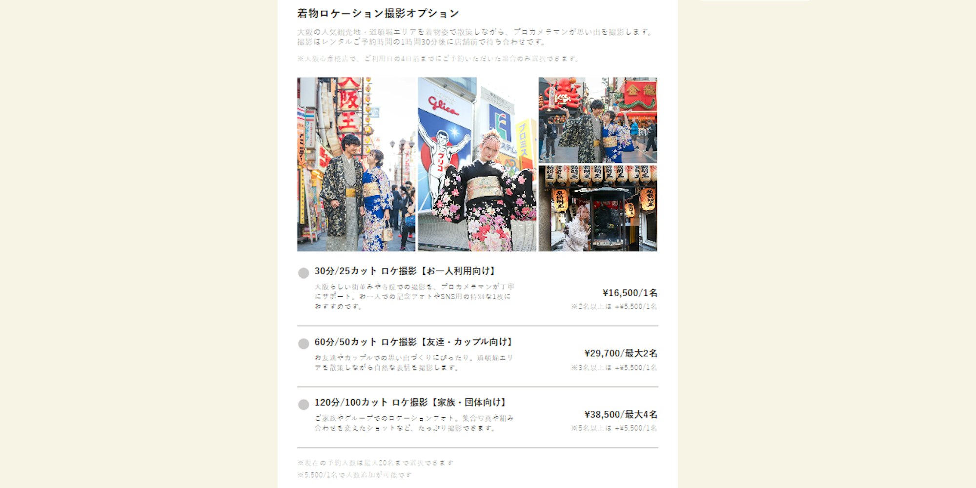 予約フォーム内で「着物ロケーション撮影オプション」を追加してください。