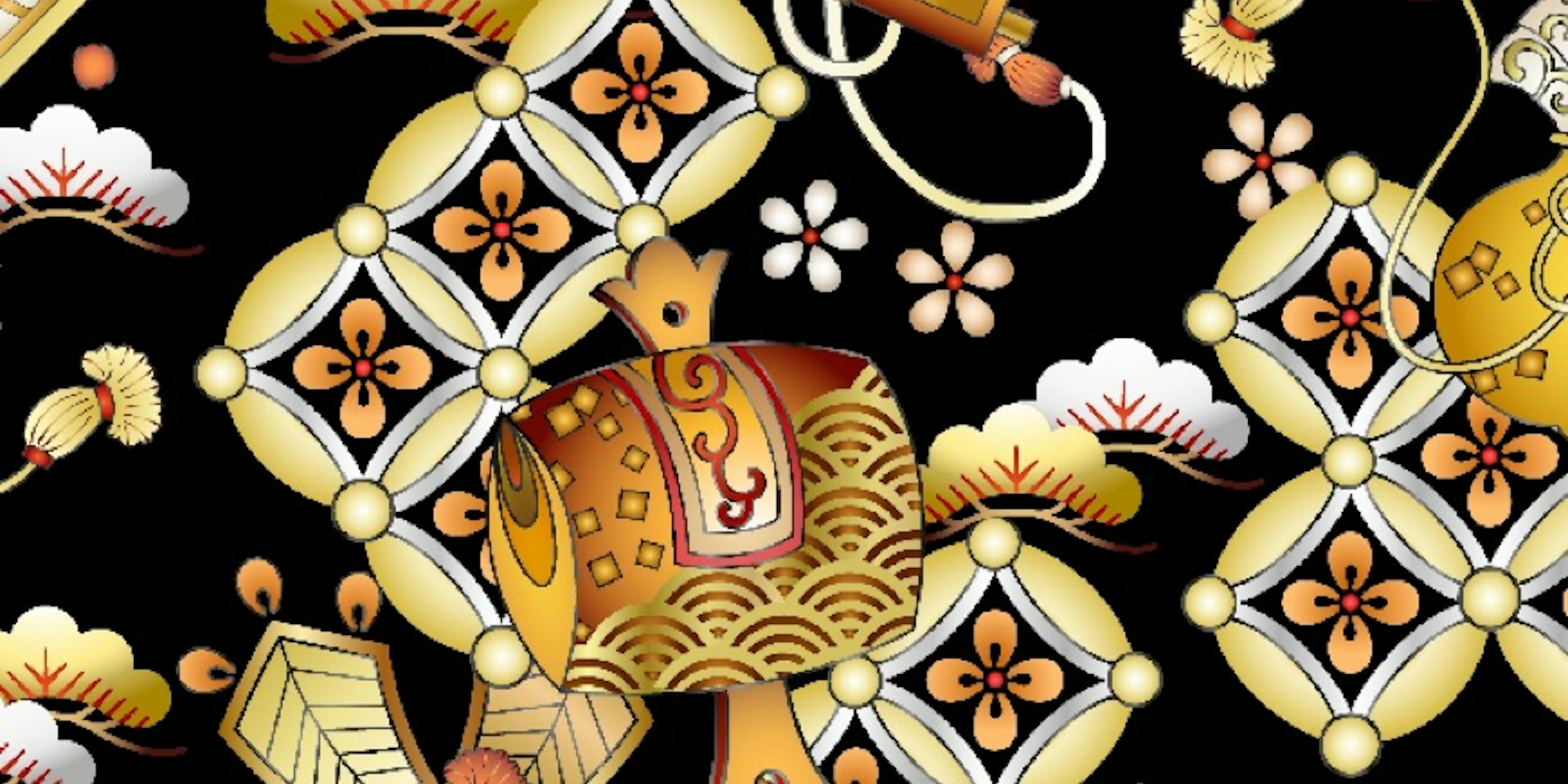 おめでたい模様であることから、「宝尽くし」と呼ばれる柄の 1つとされ、金嚢(きんのう)や宝珠などの宝物と共に描かれることの多いモチーフです。