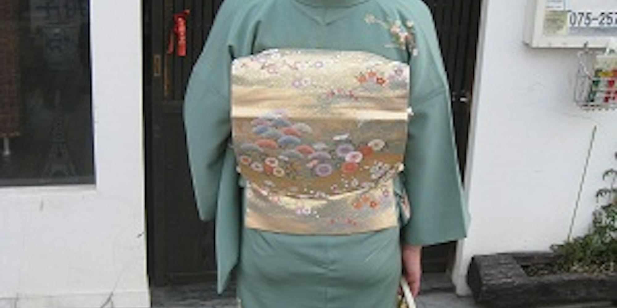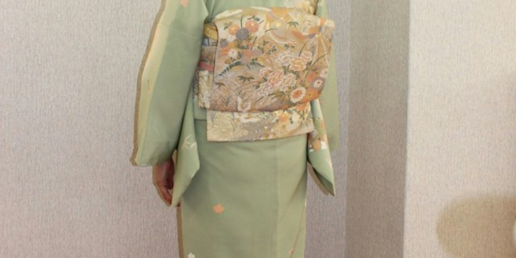 ー落ち着いたグリーン系の訪問着に金糸の袋帯を合わせて。訪問着+金の袋帯という卒業式の模範的スタイル!