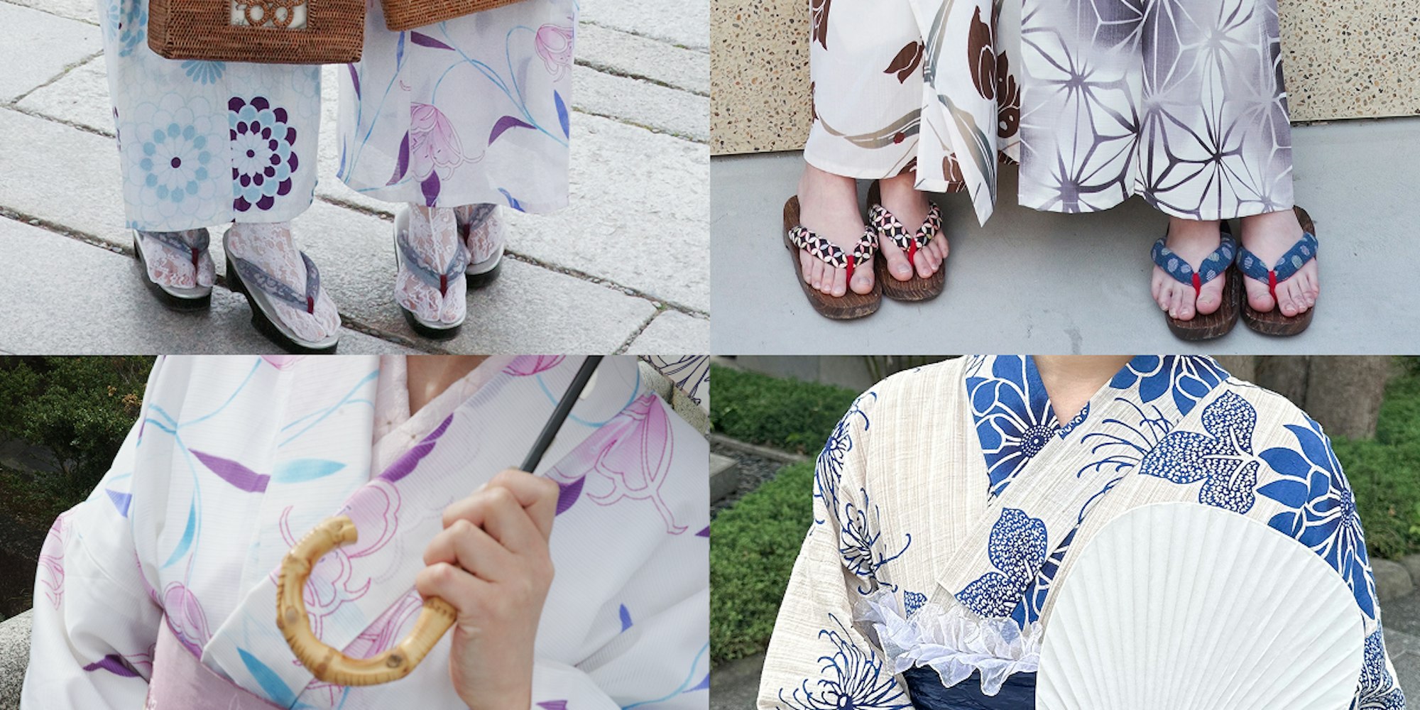 夏着物:(左上)足袋を着用・(左下)襟あり/浴衣:(右上)足袋なし・(右下)襟なし