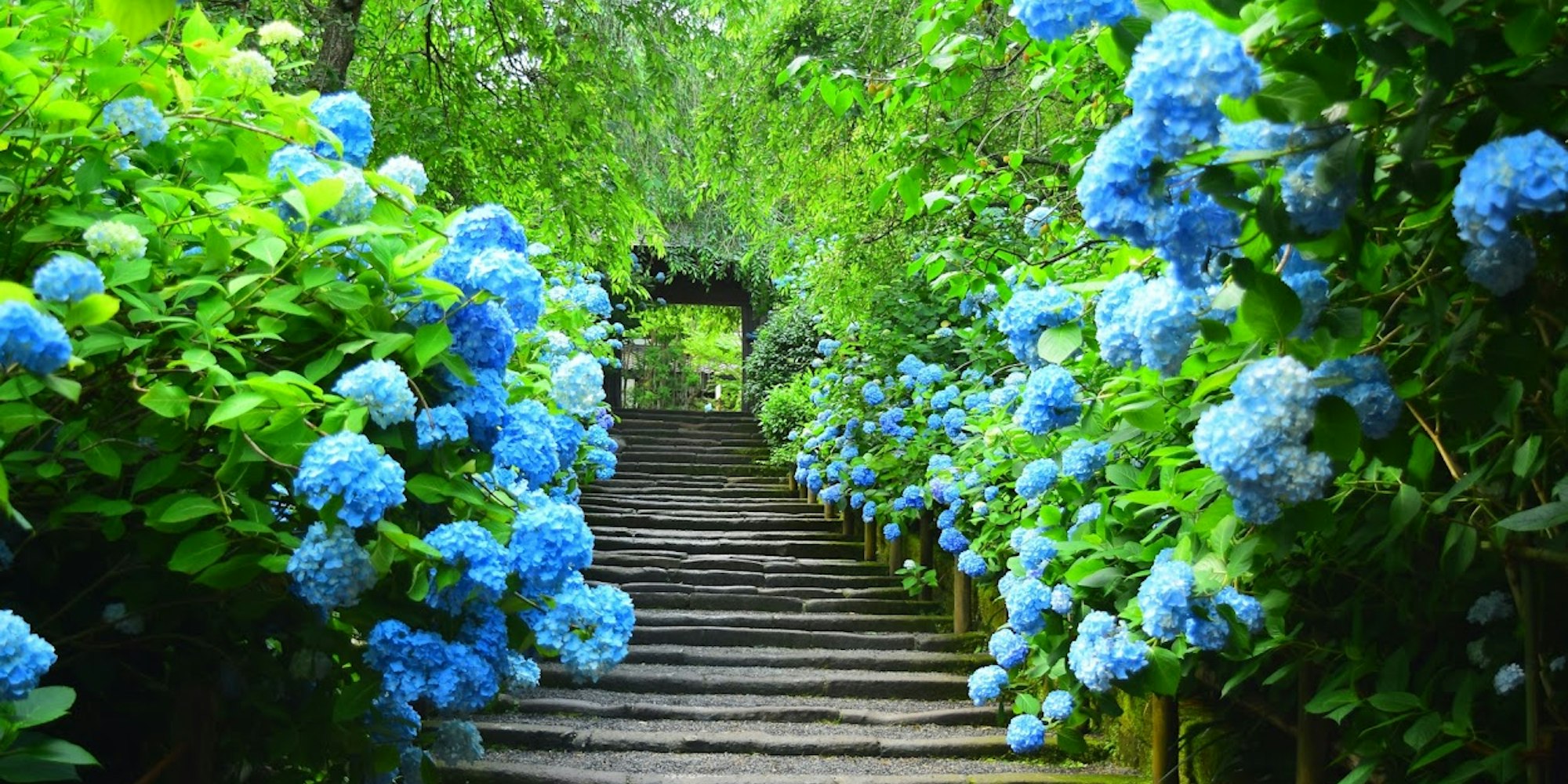 境内には数千の紫陽花が植えられており、5月頃が見頃のピークです。明月院ブルーと呼ばれる青い紫陽花が一斉に咲き誇り、境内を彩ります。