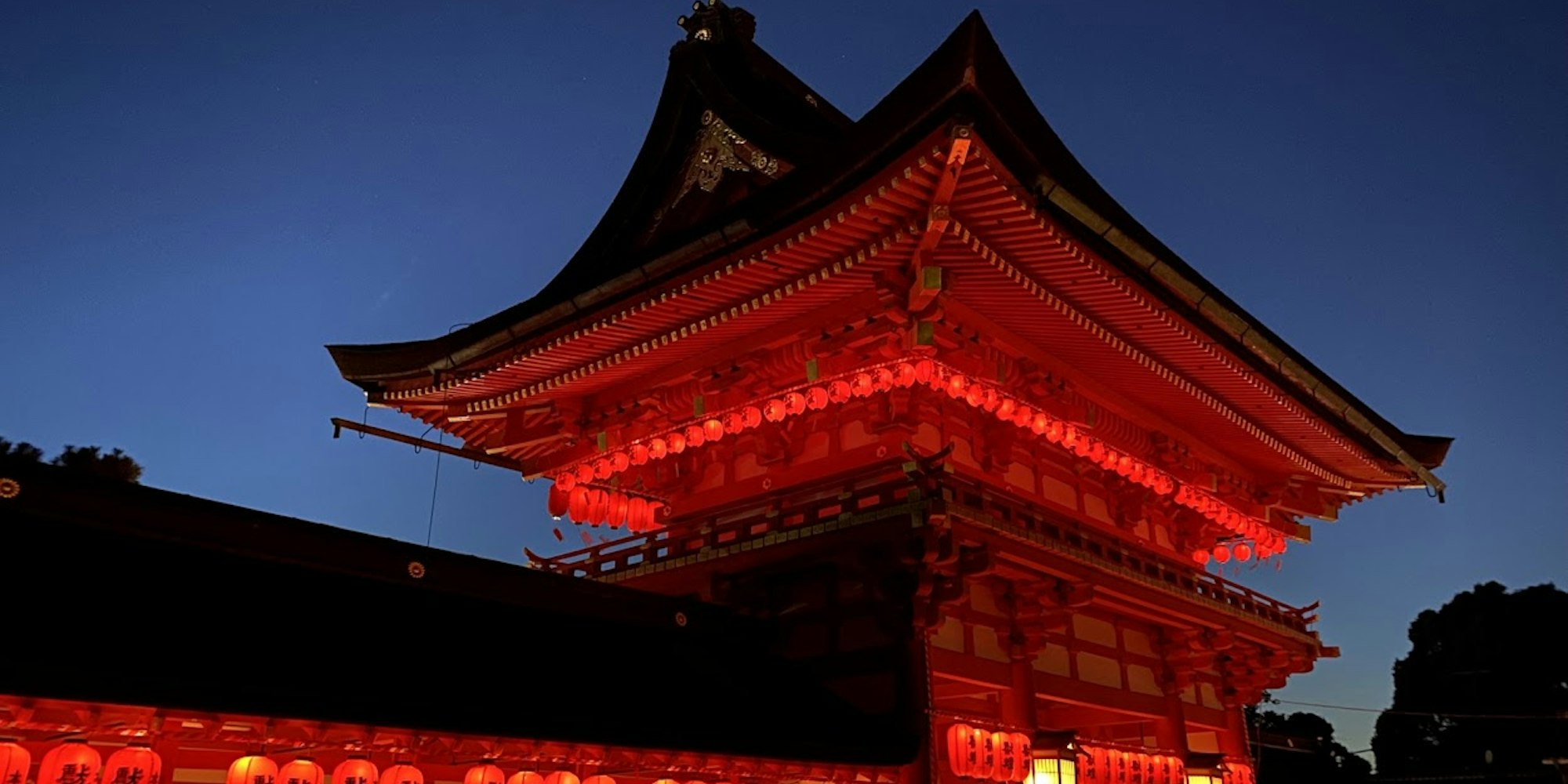 宵宫祭时,稻荷山和整个境内会点亮数千盏灯笼,营造出梦幻般的景色。本就以千本鸟居闻名的伏见稻荷大社,在这一年一度的特别日子里会变得更加梦幻。